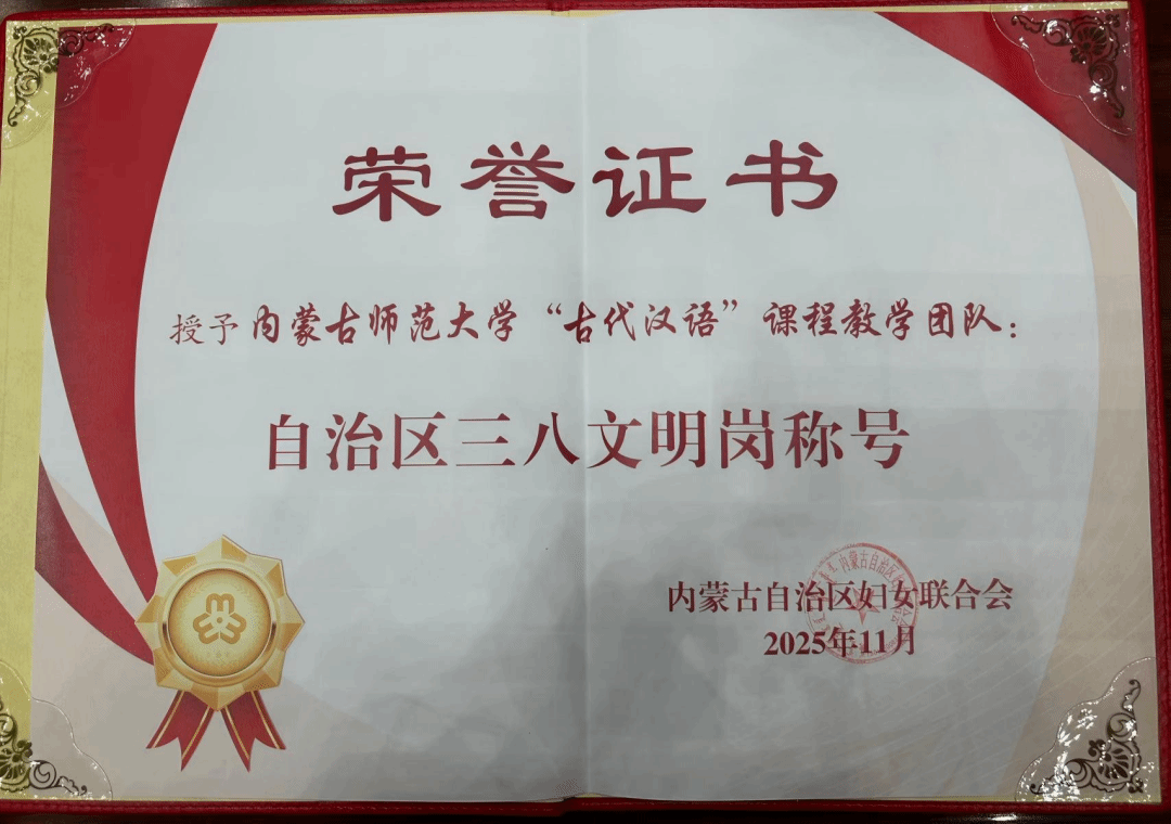 2025年12月31日上午,自治区三八红旗手(标兵、集体)、自治区三八文明岗表彰大会召开。会议授予15人“自治区三八红旗手标兵”称号,授予200人“自治区三八红旗手”称号,授予149个单位“自治区三八红旗集体”称号,授予200个单位“自治区三八文明岗”称号。我院“古代汉语”课程教学团队荣获“自治区三八文明岗”荣誉称号。